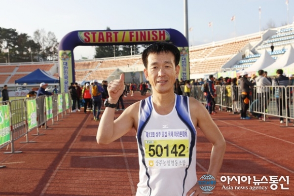 경북 상주 시민운동장에서 15일 열린 '제13회 상주곶감국제마라톤대회'에서 풀코스 1000회에 도전하는 황중창씨(56.포항)가 대회 시작 전 출발선에서 포즈를 취하고 있다./아시아뉴스통신=김철희 기자 2015-11-15