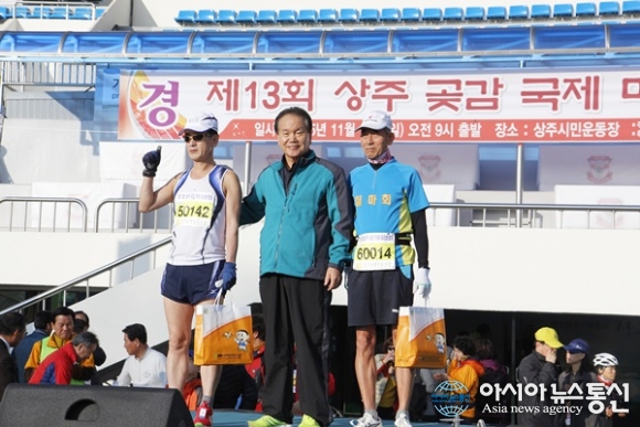 15일 오전 이정백 경북 상주시장이 상주시민운동장에서 열린 '제13회 상주곶감국제마라톤대회' 개회식에서 풀코스 1000회에 출전하는 황중창씨(56.포항.사진 왼쪽)와 최고령 참가자인 김진환씨(77.사진 오른쪽)에게 '상주곶감'을 선물하고 있다./아시아뉴스... 2015-11-15