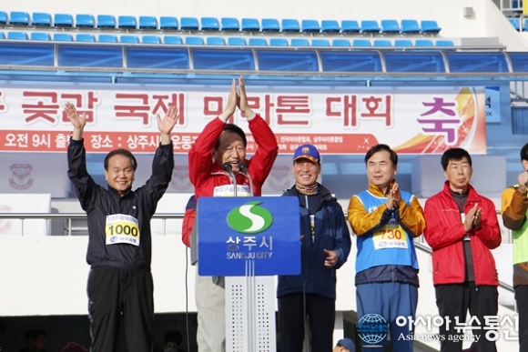 15일 오전 김종태 국회의원이 '제13회 상주곶감국제마라톤대회' 개회식에서 '상주곶감 만세' 3창을 외치며 대회 개최를 축하하고 있다./아시아뉴스통신=김철희 기자 2015-11-15