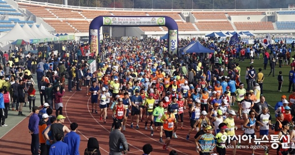 경북 상주 시민운동장에서 15일 열린 '제13회 상주곶감국제마라톤대회'에 참가한 선수들이 출발신호에 맞춰 스타트 하고 있다. 이날 대회는 시민운동장을 출발 상주보를 횡단해 강창교 방향 1.1km를 반환하는 풀코스로 대한육상경기연맹 마라톤 공인코스를 달리... 2015-11-15