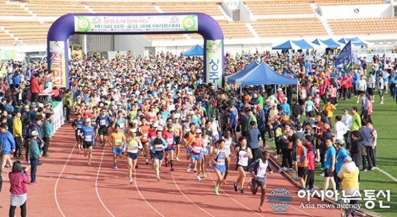 15일 경북 상주 시민운동장에서 열린 '제13회 상주곶감 국제마라톤대회'에 참가한 선수 및 동호인들이 신호에 맞춰 출발하고 있다./아시아뉴스통신=김철희 기자 지역 특산물인 상주곶감을 비롯한 농.특산품을 전국에 홍보하기 위해 '제13회 ... 2015-11-15