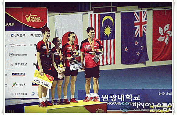 지난 8일 전주 화산체육관에서 열린 '2015 전주 빅터코리아마스터즈배드민턴대회' 혼합복식에서 우승한 고성현(김천시청) 김하나(삼성전기)선수 등이 메달을 목에 걸고 기뻐하고 있다.(사진제공=김천시청) 경북 김천시청 배드민턴팀이 지난 3~8... 2015-11-10