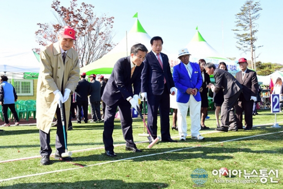 지난달 30일 고윤환 문경시장이 영강체육공원에서 열린 개막식에 참석해 이한성 국회의원이 바라보는 가운데 시타를 하고 있다.(사진제공=문경시청) 경북 문경시(시장 고윤환)가 주최하는 '제19회 노인의 날 기념식 및 제5회 시장기 노인게이트볼대... 2015-11-01