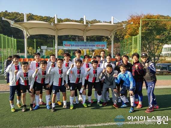 31일 청주 용정축구공원에서 열린 35회 청주산업단지관리공단 이사장배 직장축구대회에서 우승을 차지한 SK하이닉스선수들이 기념촬영을 하고 있다.(사진제공=청주산업단지관리공단) SK하이닉스가 제35회 청주산업단지관리공단 이사장배 직장축구대... 2015-11-01