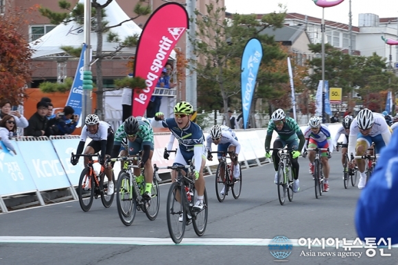 국내 최대 규모의 동호인 도로 사이클 대회인 투르드 코리아 2015 스페셜 대회에 참가한 선수들이 지난달 30일 충남 청양에서 80.4㎞의 두 번째 레이스를 마쳤다.사진은 피니시 라인을 향해 선수들이 역주하고 있다.(사진제공= 청양군청) 2015-11-01