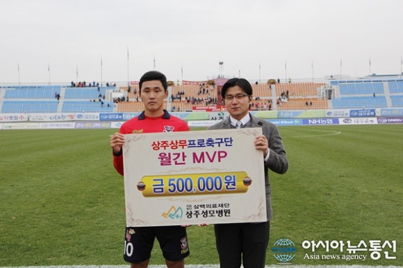 1일 오후 상주 상무 조동건 선수가 경남FC와의 '현대오일뱅크 K리그 챌린지 2015 41라운드' 홈경기 하프타임에 상주성모병원이 주관하는 10월 월간 MVP를 수상하고 기념사진을 찍고 있다. 조동건은 이날 후반전 13분에 첫골을 넣어 의미를 더했다. 시상은 김형준 신경... 2015-11-01