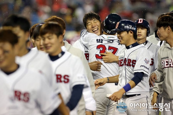 승리 후 기뻐하는 두산 베어스 선수단./아시아뉴스통신 DB 두산 베어스가 삼성 라이온즈를 제압하고 한국시리즈 우승까지 1승만을 남겨놓게 됐다. 두산은 30일 잠실구장에서 열린 프로야구 2015 타이어뱅크 KBO리그 한국시리즈(7전4승제) 4차전에서 삼성... 2015-10-31