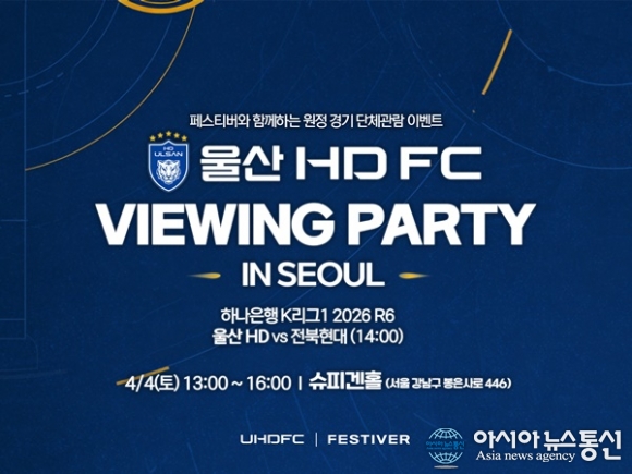 (사진제공=울산 HD FC) [아시아뉴스통신=이상진 기자] 울산 HD와 슈피겐코리아의 팬덤 라이프스타일 브랜드 ‘페스티버(FESTIVER)’가 수도권 팬들을 위한 특별한 응원전을 공동 개최한다. 울산과 페스티버는 4월 4일 오후 2시에 열리는 전북현대와의 리그 원정경기에 맞춰 서울 강남구 ... 2026-03-23