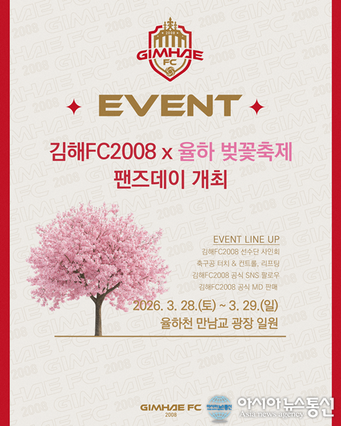 (사진제공=김해FC) [아시아뉴스통신=이상진 기자] 김해FC2008(이하 김해FC)이 오는 28일 ‘제7회 율하 벚꽃축제’ 현장에서 팬들과 직접 소통하는 ‘팬즈데이’를 개최한다고 밝혔다. 이번 행사는 봄을 맞아 율하천 만남교 광장 일원에서 열리는 벚꽃축제와 연계하여 진행된다. ... 2026-03-23