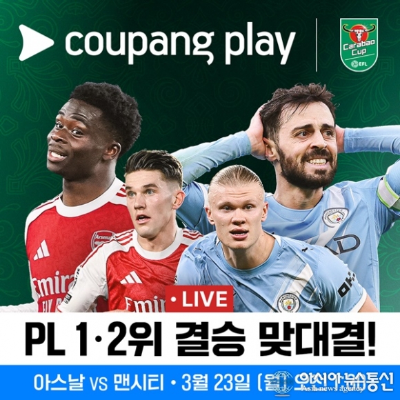 (사진제공=쿠팡플레이) [아시아뉴스통신=이상진 기자] 쿠팡플레이가 오는 23일 오전 1시 30분, ‘축구의 성지’ 웸블리 스타디움에서 열리는 아스날과 맨체스터 시티(이하 맨시티)의 카라바오컵 결승전을 독점 생중계한다. 이번 경기는 현재 프리미어리그 1, 2위를 다투는 양 팀의 맞대... 2026-03-20