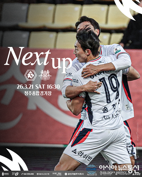 (사진제공=충북청주FC) [아시아뉴스통신=이상진 기자] 충북청주FC(이하 충북청주)가 안방에서 시즌 첫 승을 향한 거침없는 도전에 나선다. 오는 3월 21일 청주종합경기장에서 하나은행 K리그2 2026 4라운드 안산그리너스(이하 안산)와 맞붙는다. 지난 라운드에서 지고 있던 경기를 무서운 ... 2026-03-20