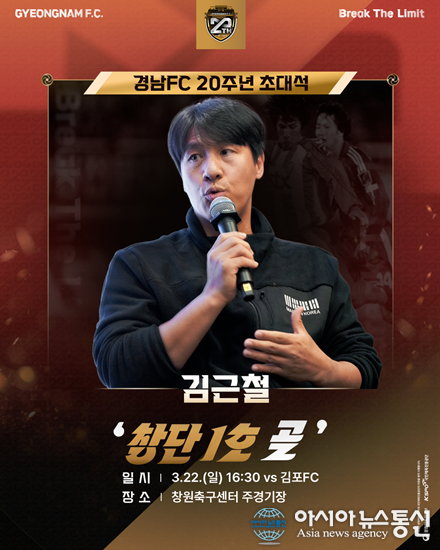(사진제공=경남FC) [아시아뉴스통신=이상진 기자] 경남FC가 홈 개막전 배기종 전 선수에 이어 ‘20주년 초대석’을 통해 창단 20주년 분위기를 한층 끌어올린다. 경남은 오는 22일 오후 4시 30분 창원축구센터에서 김포FC를 상대로 하나은행 K리그2 2026 4라운드 홈경기를 치른다. 충북... 2026-03-20