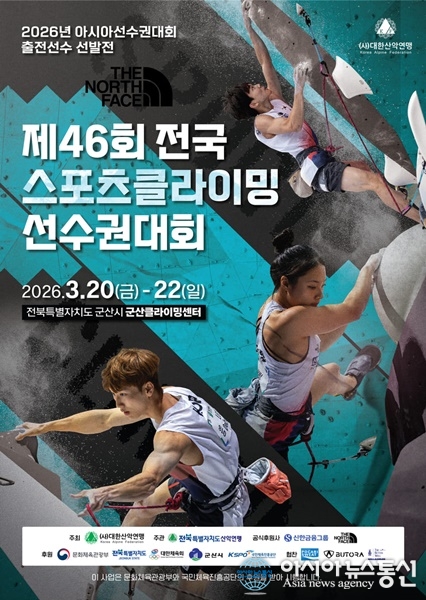 (사진제공=대한산악연맹) [아시아뉴스통신=이상진 기자] 사단법인 대한산악연맹(회장 조좌진)은 '제46회 전국 스포츠클라이밍 선수권대회'(2026 아시아 선수권 대회 출전 선수 선발전)가 오는 3월 20일부터 22일까지 3일간 전북 군산시 군산클라이밍센터에서 개최된다고 밝혔다. 이번 ... 2026-03-19