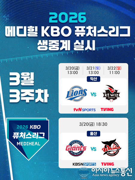 (사진제공=KBO) [아시아뉴스통신=이상진 기자] KBO는 3월 20일 개막하는 2026 메디힐 KBO 퓨처스리그 경기를 TV 채널 tvN SPORTS, KBSN SPORTS와 OTT 플랫폼 TVING을 통해 생중계 한다. 올해 KBO는 퓨처스리그 전체 726경기 중 약 120경기를 tvN SPORTS에서, 약 40경기는 KBSN SPORTS를 통해 생중계 한다. 또한, TV 중... 2026-03-19