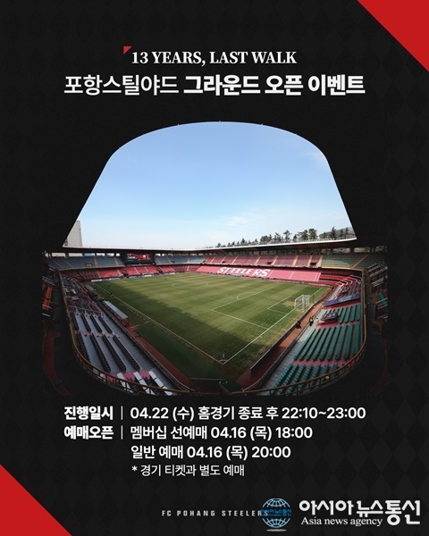 (사진제공=포항 스틸러스) [아시아뉴스통신=이상진 기자] 포항스틸러스가 13년 만의 스틸야드 잔디 전면 교체를 앞두고 팬들과 특별한 시간을 갖는다. 포항스틸러스는 오는 22일 오후 7시 30분 포항스틸야드에서 광주FC와 홈경기를 치른 뒤, 경기 종료 후 ‘13 YEARS, LAST WALK’ 행사를 ... 2026-04-16