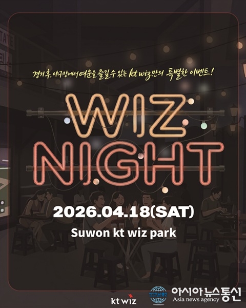 (사진제공=KT 위즈) [아시아뉴스통신=이상진 기자] kt wiz 프로야구단이 오는 18일 키움 히어로즈와의 경기 종료 후 위즈파크 2층 F&B 구역에서 야장 콘셉트의 ‘위즈 나잇(WIZ NIGHT)’를 운영한다고 밝혔다. 사전 신청을 완료한 100명의 팬들을 대상으로 진행되는 ‘위즈 나잇’ ... 2026-04-16