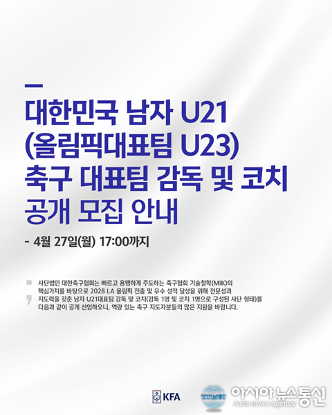 (사진제공=대한축구협회) [아시아뉴스통신=이상진 기자] 대한축구협회(KFA)가 2028년 LA 올림픽까지 팀을 이끌 남자 올림픽 대표팀의 감독과 코치를 공개 채용한다. 이번 채용은 지난 남자 20세 이하 대표팀 감독 공개채용에 이어 협회의 두 번째 연령별 대표팀 지도자 공개채용이다. 대한축... 2026-04-16