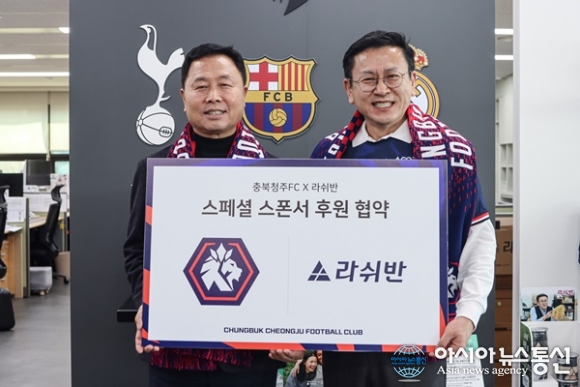 (사진제공=충북청주FC) [아시아뉴스통신=이상진 기자] 충북청주프로축구단(대표이사 김현주, 이하 충북청주FC)이 프리미엄 언더웨어 브랜드 ‘라쉬반’과 후원 협약을 체결했다. 충북청주FC는 지난 14일 경남 창원에 본사를 둔 라쉬반코리아(대표이사 백경수)와 후원 협약식을 가졌... 2026-03-17