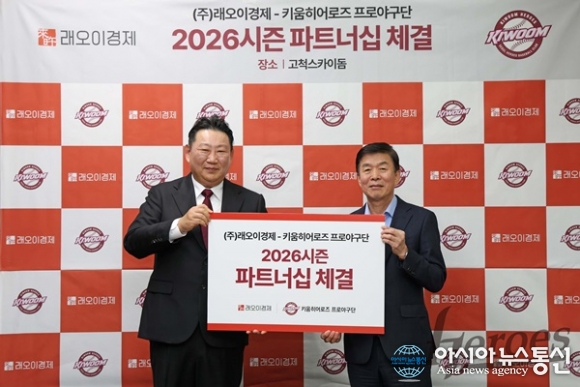(사진제공=키움 히어로즈) [아시아뉴스통신=이상진 기자] 키움히어로즈는(대표이사 위재민)는 13일 프리미엄 건강기능식품 브랜드 래오이경제와 파트너십 계약을 체결했다. 이번 계약을 통해 키움은 포수 후면 LED에 래오이경제 광고를 노출하고, 래오이경제는 광고에 따른 후원을 진행... 2026-03-16