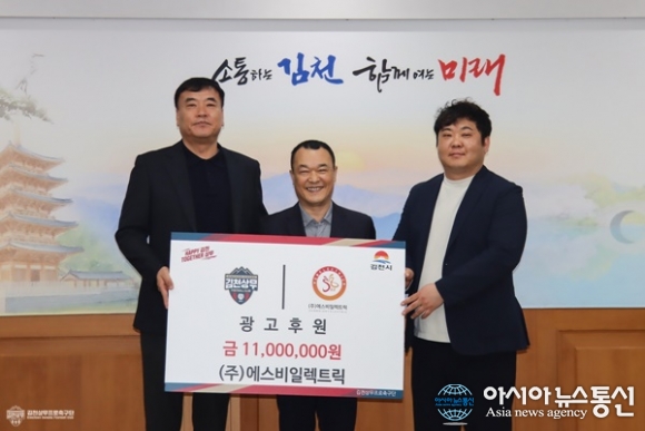 (사진제공=김천상무프로축구단) [아시아뉴스통신=이상진 기자] (주)에스비일렉트릭이 김천상무에 4년 연속 후원을 이어간다. 김천상무프로축구단(대표이사 이재하)이 3월 12일, 김천시청에서 (주)에스비일렉트릭의 후원금 전달식을 진행했다. 행사에는 에스비일렉트릭 김대견 대표이사, ... 2026-03-16