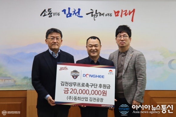 (사진제공=김천상무프로축구단) [아시아뉴스통신=이상진 기자] (주)동희산업이 김천상무에 5년 연속 후원을 이어간다. 김천상무프로축구단(대표이사 이재하)이 3월 13일, 김천시청에서 (주)동희산업의 후원금 전달식을 진행했다. 행사에는 동희산업 박주은 대표이사, 박치완 상무(김천공... 2026-03-16
