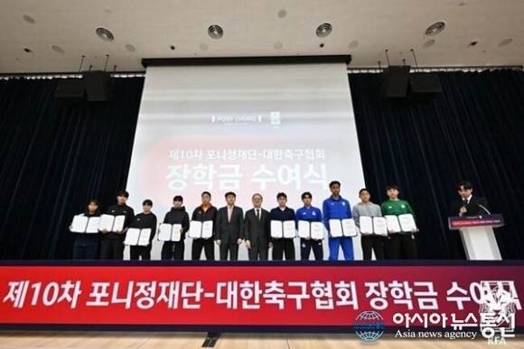 (사진제공=대한축구협회) [아시아뉴스통신=이상진 기자] 대한축구협회와 포니정재단이 10일 코리아풋볼파크 스타디움 1층 대강당에서 ‘제10차 포니정재단-대한축구협회 장학금 수여식’을 열고 남녀 중학교 선수 100명에게 장학금을 전달했다. 이번 장학금 수여 대상자는 남녀 중... 2026-03-12