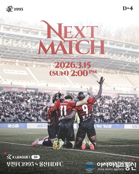 (사진제공=부천FC1995) [아시아뉴스통신=이상진 기자] 부천FC1995(구단주 조용익 부천시장, 이하 부천)가 오는 15일 오후 2시 부천종합운동장에서 열리는 '하나은행 K리그1 2026' 3라운드에서 울산 HD FC(이하 울산)을 상대로 구단 역대 최다 무패 기록 경신에 도전한다. 부천은 지난 7일 대... 2026-03-12