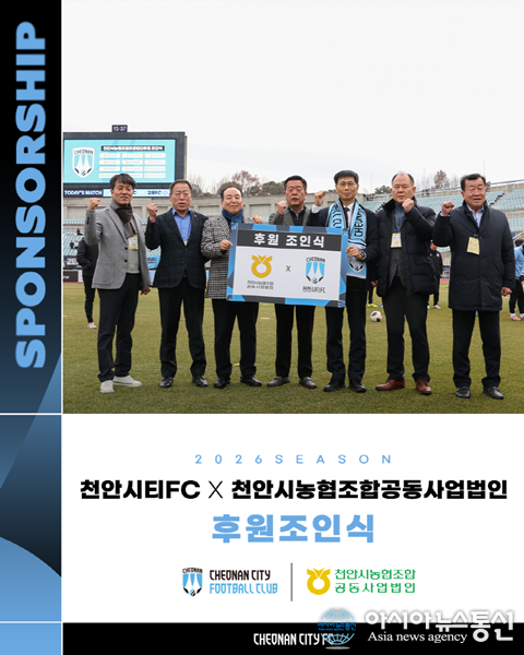 (사진제공=천안시티FC) [아시아뉴스통신=이상진 기자] 천안시민프로축구단(이하 천안시티FC)과 천안시농협조합공동사업법인이 공식 후원 계약을 체결했다. 천안시티FC는 지난 8일 열린 홈경기에서 천안시농협조합공동사업법인과 후원조인식을 진행했다. 이날 조인식에는 천안시티FC 김... 2026-03-12