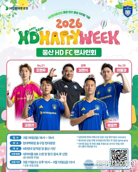 (사진제공=울산 HD FC) [아시아뉴스통신=이상진 기자] 울산 HD가 울산을 대표하는 스포츠 구단으로서 지역 밀착 행보를 이어간다. 울산은 HD현대가 주최하는 ‘HD해피위크’에서 지역 주민과 임직원을 대상으로 사인회를 진행한다. ‘HD해피위크’는 HD현대가 지역 주민들께 ... 2026-03-12