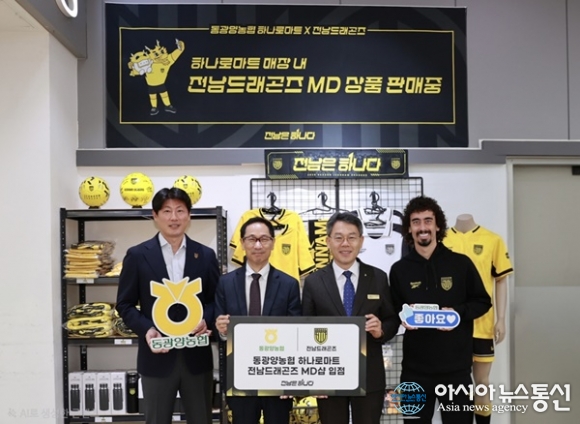 (사진제공=전남 드래곤즈) [아시아뉴스통신=이상진 기자] 전남드래곤즈가 광고후원사 동광양농협(조합장 이돈성)이 운영하는 하나로마트에 입점해 유니폼을 비롯한 다양한 MD(Merchandise) 상품을 상시 판매한다. 전남과 동광양농협은 3월 10일 오후 동광양농협 하나로마트 대형점에서 전남... 2026-03-12