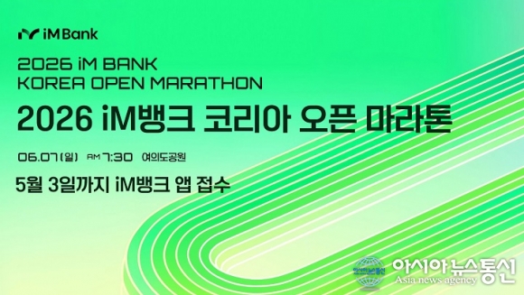iM뱅크는 오는 6월7일 서울 여의도공원 일대에서 '2026 iM뱅크 코리아 오픈 마라톤'을 개최한다.(자료제공=iM뱅크) [아시아뉴스통신=윤석원 기자] iM뱅크(은행장 강정훈)는 오는 6월7일 서울 여의도공원 일대에서 '2026 iM뱅크 코리아 오픈 마라톤'을 개최한다고 밝혔다. 2026년 시중은... 2026-04-16