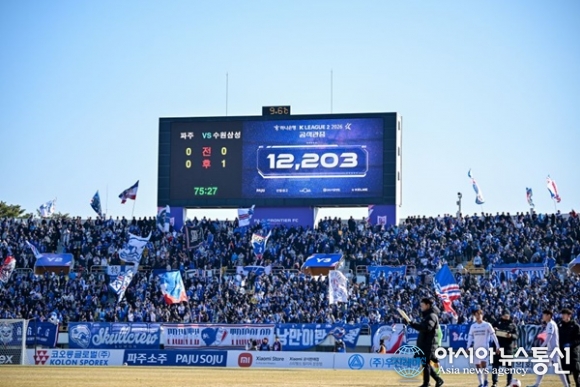 (사진제공=파주 프런티어 FC) [아시아뉴스통신=이상진 기자] 파주 프런티어 FC가 창단 이후 처음 치른 홈 개막전에서 K리그 흥행 기록을 만들어 냈다. 파주 프런티어 FC는 파주스타디움에서 열린 수원삼성블루윙즈와의 경기에서 0-1로 아쉽게 패했다. 하지만 이날 경기에는 12,203명의 관중이... 2026-03-10