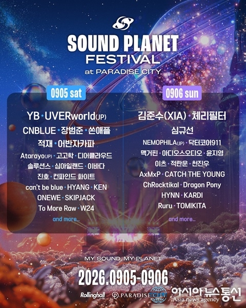 (사진제공=롤링홀) [아시아뉴스통신=이상진 기자] 홍대 음악의 성지 롤링홀이 주최, 주관하는 ‘사운드플래닛페스티벌 2026’의 플래닛크루티켓이 팬들의 폭발적인 관심속에 17일 오후 2시 오픈한다. ‘사운드플래닛페스티벌 2026’은 오는 9월 5일과 6일 양일간 파라다이스시... 2026-03-17