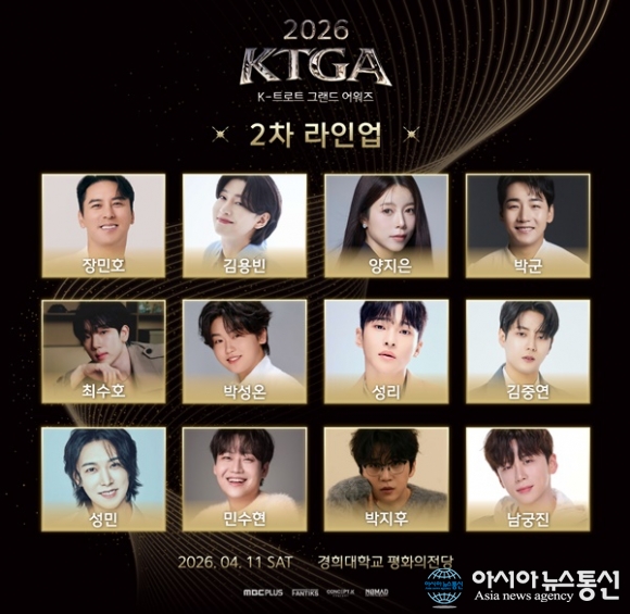 (사진제공=팬틱스, 컨셉케이컴퍼니) [아시아뉴스통신=이상진 기자] 2026 K-트롯 그랜드 어워즈(2026 K-TROT GRAND AWARDS)’의 2차 라인업에 장민호, 김용빈, 양지은 등 총 12명이 이름을 올려 세간의 화제가 되고 있다. ‘2026 K-트롯 그랜드 어워즈’는 뮤빗, 셀럽챔프, 팬캐스트를 통해 진... 2026-03-17