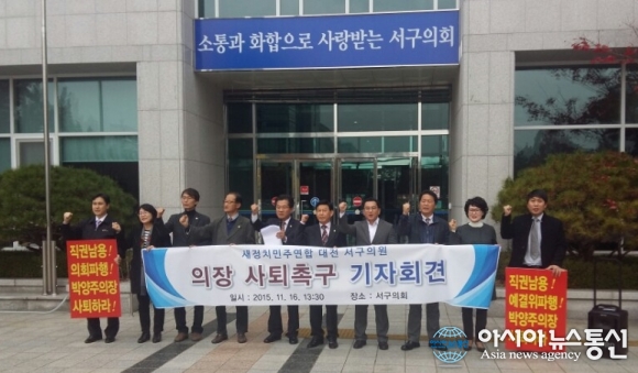 16일 대전서구의회 새정치민주연합 소속 의원들이 기자회견을 갖고 '박양주 의장은 사퇴하라'라는 구호를 외치고 있다./아시아뉴스통신=박하늘 기자 "박양주 의장은 서구의회 질서파탄과 파행 추태에 대한 책임을 지고 당장 의장직을 사퇴... 2015-11-16