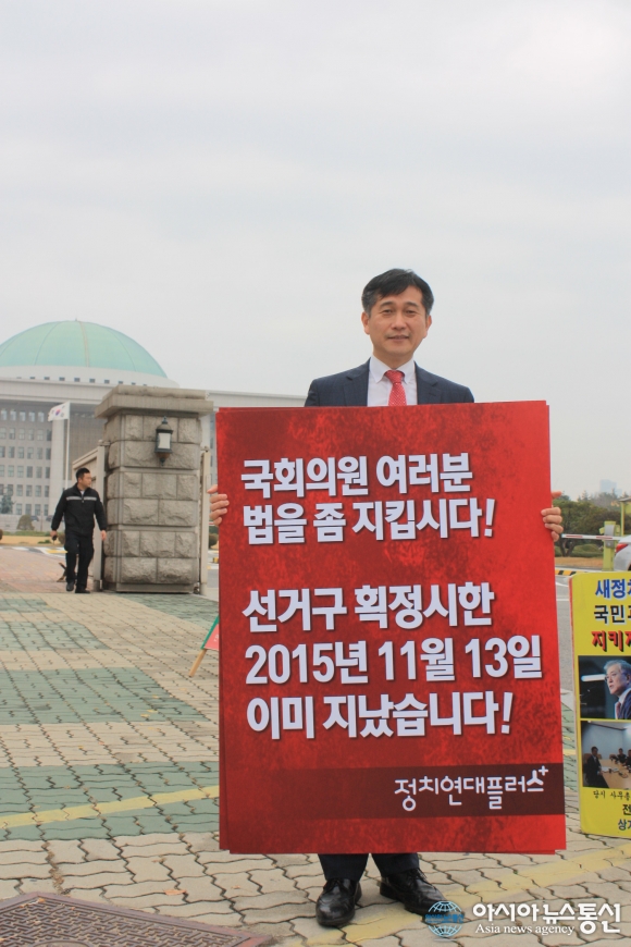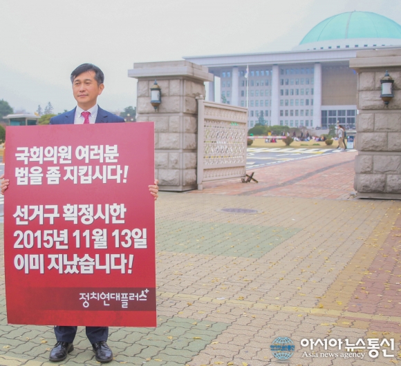 16일 오후 정치연대 플러스 허숭 대표가 국회앞에서 선거구 획정과 관련 1인 시위를 하고 있다./아시아뉴스통신=최정면 기자 국회가 지난 13일 2016년도 총선에 적용될 선거구획정과 관련해 시한을 넘기면서 '여야 밀실야합'이란 원성을 산 가운... 2015-11-16