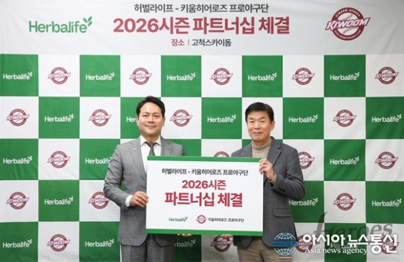 (사진제공=키움 히어로즈) [아시아뉴스통신=이상진 기자] 키움히어로즈(대표이사 위재민)는 건강 및 웰니스 뉴트리션 전문 글로벌 기업 한국허벌라이프와 2026시즌 공식 뉴트리션 후원 계약을 체결했다. 키움히어로즈와 한국허벌라이프는 이번 계약을 통해 2년 연속 파트너십을 이어가게... 2026-03-06