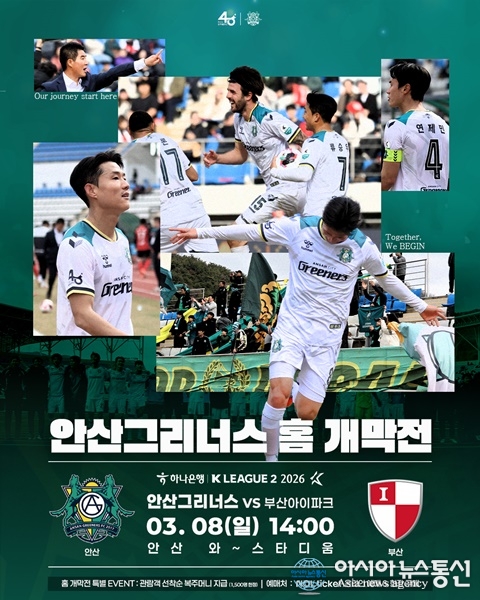(사진제공=안산 그리너스 FC) [아시아뉴스통신=이상진 기자] 안산그리너스FC(이하 안산)가 2026시즌 홈 개막전서 2연승에 도전한다. 안산은 오는 8일 오후 2시 안산 와~스타디움에서 부산아이파크(이하 부산)를 상대로 하나은행 K리그2 2026 2라운드 홈 개막전을 치른다. 안산은 1라운드에서 김... 2026-03-05