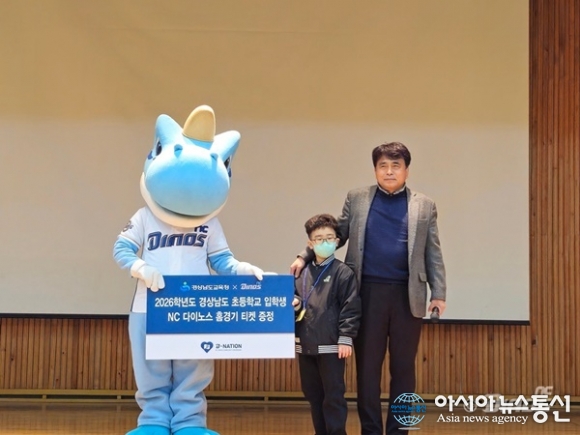 (사진제공=NC 다이노스) [아시아뉴스통신=이상진 기자] NC 다이노스가 경상남도교육청과 협력해 마련한 ‘2026 도내 초등 입학생 입학 축하 선물 전달’ 행사에서, 구단 마스코트 단디가 양덕초등학교 입학식을 찾아 신입생들을 응원했다. 이번 행사는 3일 열린 입학식에서 진행됐으... 2026-03-05