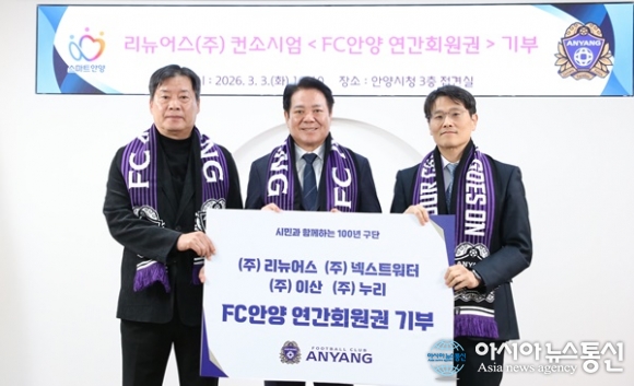 (사진제공=FC안양) [아시아뉴스통신=이상진 기자] 리뉴어스(주) 컨소시엄이 FC안양 연간회원권을 구매한 뒤 지역의 사회복지시설과 청소년 쉼터 등을 위해 활용해달라며 기부해 지역 사회에 따뜻한 온정을 전했다. 지난 3일 안양시청 접견실에서 FC안양 최대호 구단주, 이우형 단장, 리뉴... 2026-03-05