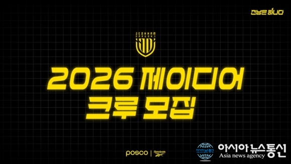 (사진제공=전남 드래곤즈) [아시아뉴스통신=이상진 기자] 전남드래곤즈가 2026시즌을 함께할 ‘제이디어(JDIA) 크루 1기’를 공개 모집하며 축구 산업 현장을 경험할 인재 발굴에 나선다. 제이디어(JDIA)는 전남드래곤즈에 대한 관심을 높이고, 축구 산업 분야 취업을 희망하는 이들이 ... 2026-02-28