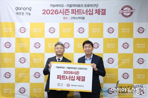 (사진제공=키움 히어로즈) [아시아뉴스통신=이상진 기자] 키움히어로즈(대표이사 위재민)는 26일 농업회사법인 가농바이오(주)와 2026시즌 파트너십 계약을 체결했다. 키움은 고척스카이돔 홈플레이트 후면 LED와 전광판 동영상 광고 권리를 제공하고, 가농바이오는 이에 따른 후원을 진행... 2026-02-27
