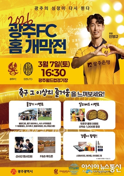 (사진제공=광주FC) [아시아뉴스통신=이상진 기자] 프로축구 광주FC가 다가오는 홈 개막전서 풍성한 행사를 통해 축제의 장을 연다. 광주는 3월 1일 제주SK FC와의 원정 1라운드를 시작으로 시즌의 포문을 연 뒤, 3월 7일 16시 30분 광주월드컵경기장에서 인천유나이티드를 상대로 홈 개막전을 ... 2026-02-27