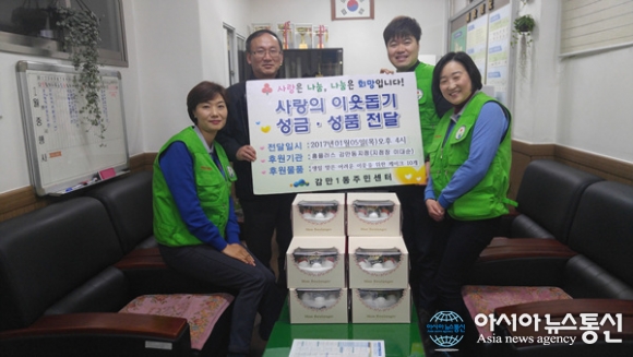 홈플러스 감만동지점이 5일 부산 남구 감만1동 주민센터에 케이크를 기증하고 기념촬영을 하고 있다.(사진제공=부산 남구청) 부산 남구 감만1동 주민센터는 지난 5일 홈플러스 감만동지점(지점장 이대순)에서 기증받은 케이크를 1월에 생일을 맞은 관내 독거노인과 한부모 가정 등 어려운 이... 2017-01-06
