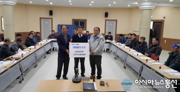 5일 경남 사천시 서포면사무소에서 서포면자율방범대가 어려운 이웃들에게 지원해 달라며 300만원 상당의 농산물상품권을 전달하고 있다.(사진제공=사천시청) 경남 사천시 서포면자율방범대(대장 윤지영,)가 5일 서포면사무소를 방문해 가정형편이 어려운 이웃들에게 지원해 달라며 300만원... 2017-01-06