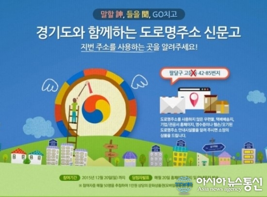 도는 지난해 3월부터 12월 말까지 10개월 간 도로명주소 신문고를 운영한 결과 총 1097명이 참여해 2만1693건의 제보가 접수됐다고 밝혔다./아시아뉴스통신DB 경기도가 도로명주소 정착을 위해 운영 중인 '도로명주소 신문고'에 지난해 접수된 제보가 2만 건을 넘은 것으로 확인됐다. 도... 2017-01-05