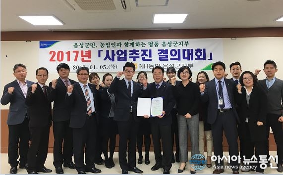 5일 농협음성군지부가 군지부 회의실에서 2017년 사업추진 결의대회를 연 가운데 반채운 지부장 등 직원들이 기념촬영을 했다.(사진제공=농협음성군지부) 농협음성군지부가 5일 군지부 회의실에서 전직원이 참석한 가운데 2017년 사업추진 결의대회를 가졌다. 행사는 농협중앙회장 및 농협... 2017-01-05