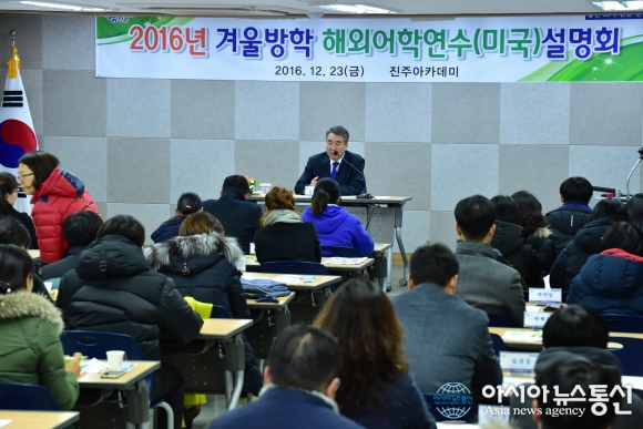 진주아카데미 중학생 겨울방학 해외어학연수 설명회 모습.(사진제공=진주시청) 진주아카데미에서는 1월5일부터 2월3일까지 30일간의 일정으로 중학생 30명이 참여하는 '진주아카데미 2016년 겨울방학 해외어학연수'를 미국 애리조나주 투산시 일원에서 진행한다. 미래를 준비하고 창... 2017-01-05
