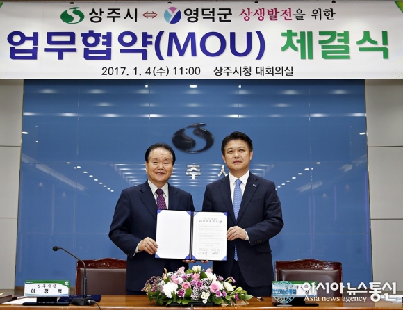 이정백 경북 상주시장(왼쪽)과 이희진 영덕군수가 4일 오전 상주시청 대회의실에서 업무 협약을 체결한 후 협약서를 들고 포즈를 취하고 있다.(사진제공=상주시청) 경북 상주시(시장 이정백)와 영덕군(군수 이희진)이 4일 오전 상주시청에서 양 지자체간 상생발전을 위한 업무 협약을 체결했... 2017-01-04