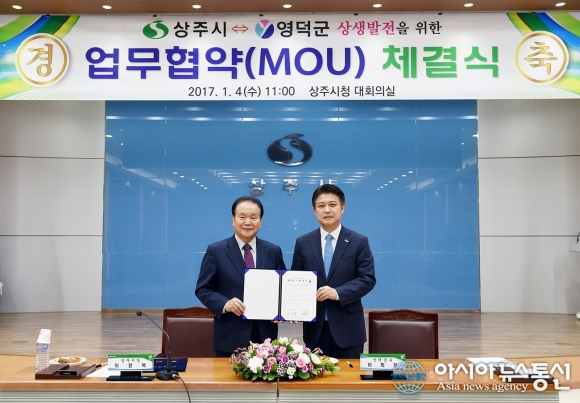4일 이희진 경북 영덕군수(오른쪽)가 상주시청을 방문해 이정백 상주시장과 '상생발전을 위한 업무협약(MOU)'을 체결하고 기념촬영을 하고 있다.(사진제공=영덕군청) '영덕-상주'간 고속도 개통으로 동서 교류 물꼬가 트이면서 지역 간 상생방안 마련이 요구되고 있는 가운데 이희... 2017-01-04